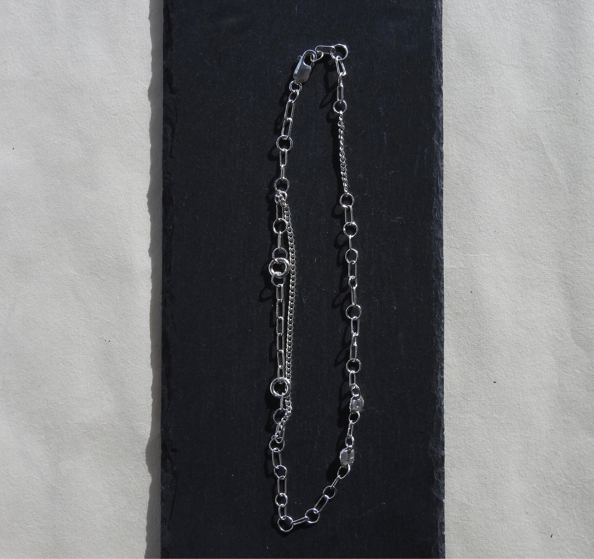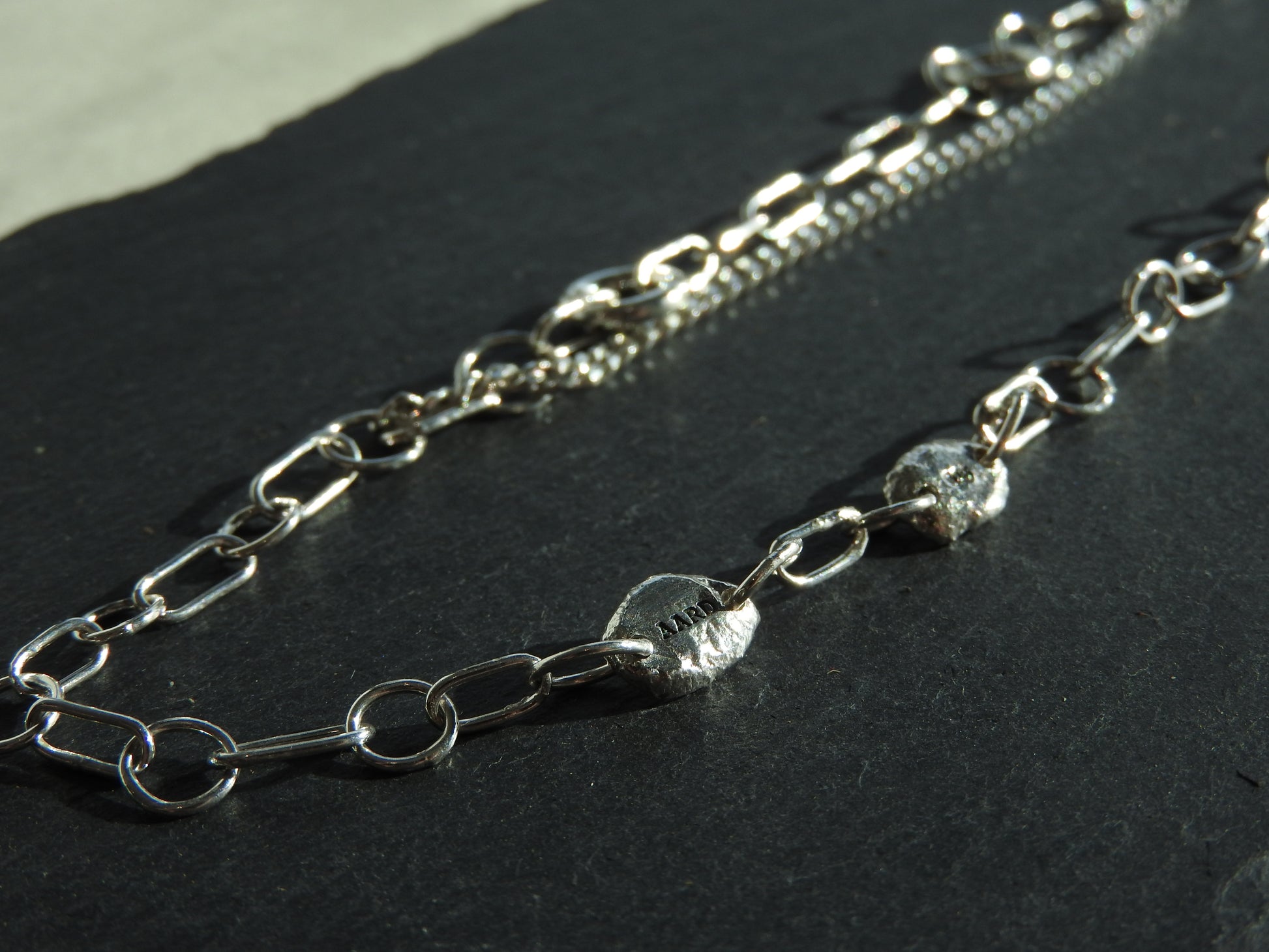 #011 Chain is a cluster f*ck of links smooshed together to make on sexy necklace or doubled over for a bracelet. Featuring two hallmark blobs and layered curb chain.