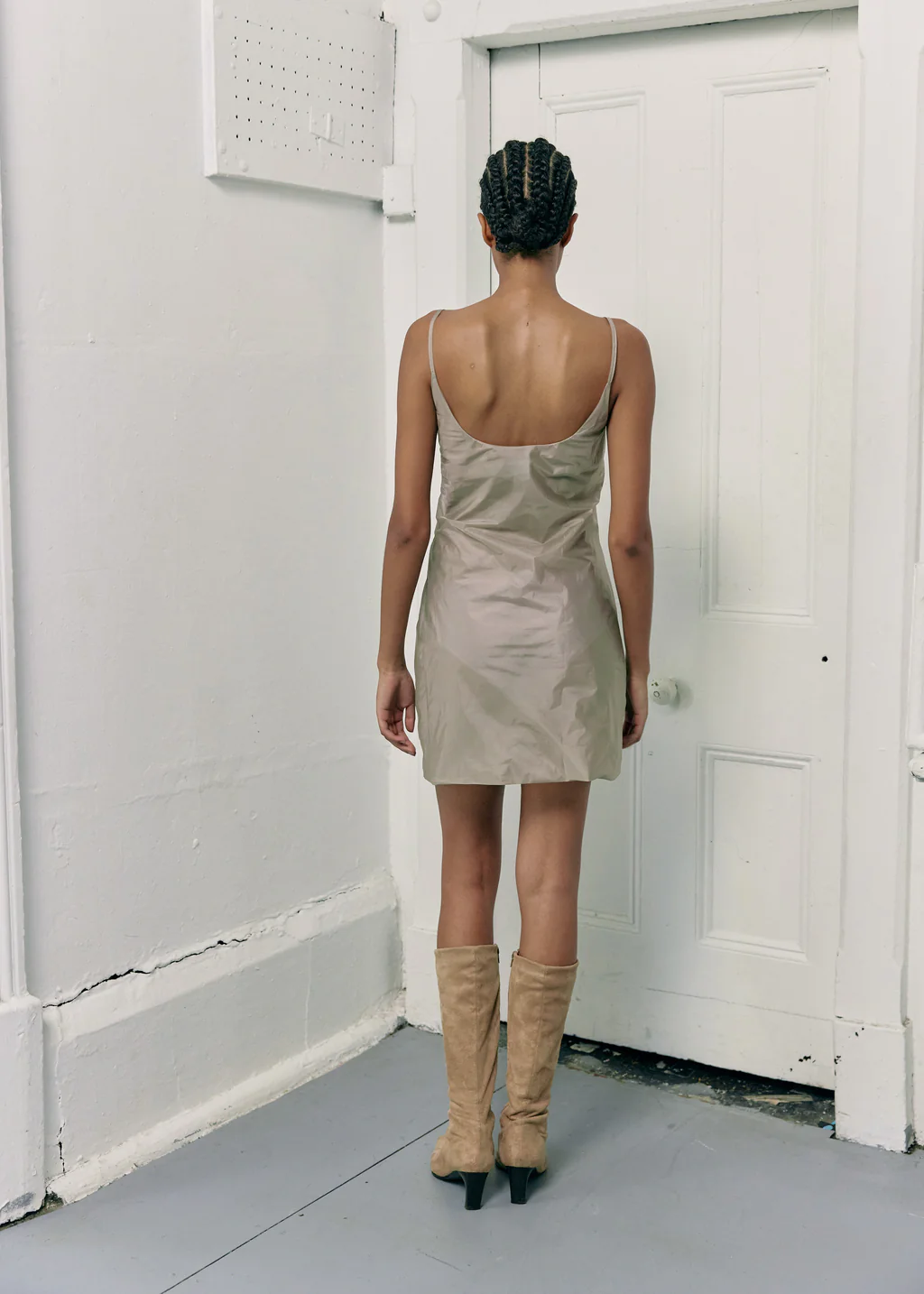 90s-inspired minidress in technical and slightly translucent nylon, fabric is double layered throughout for wearability.