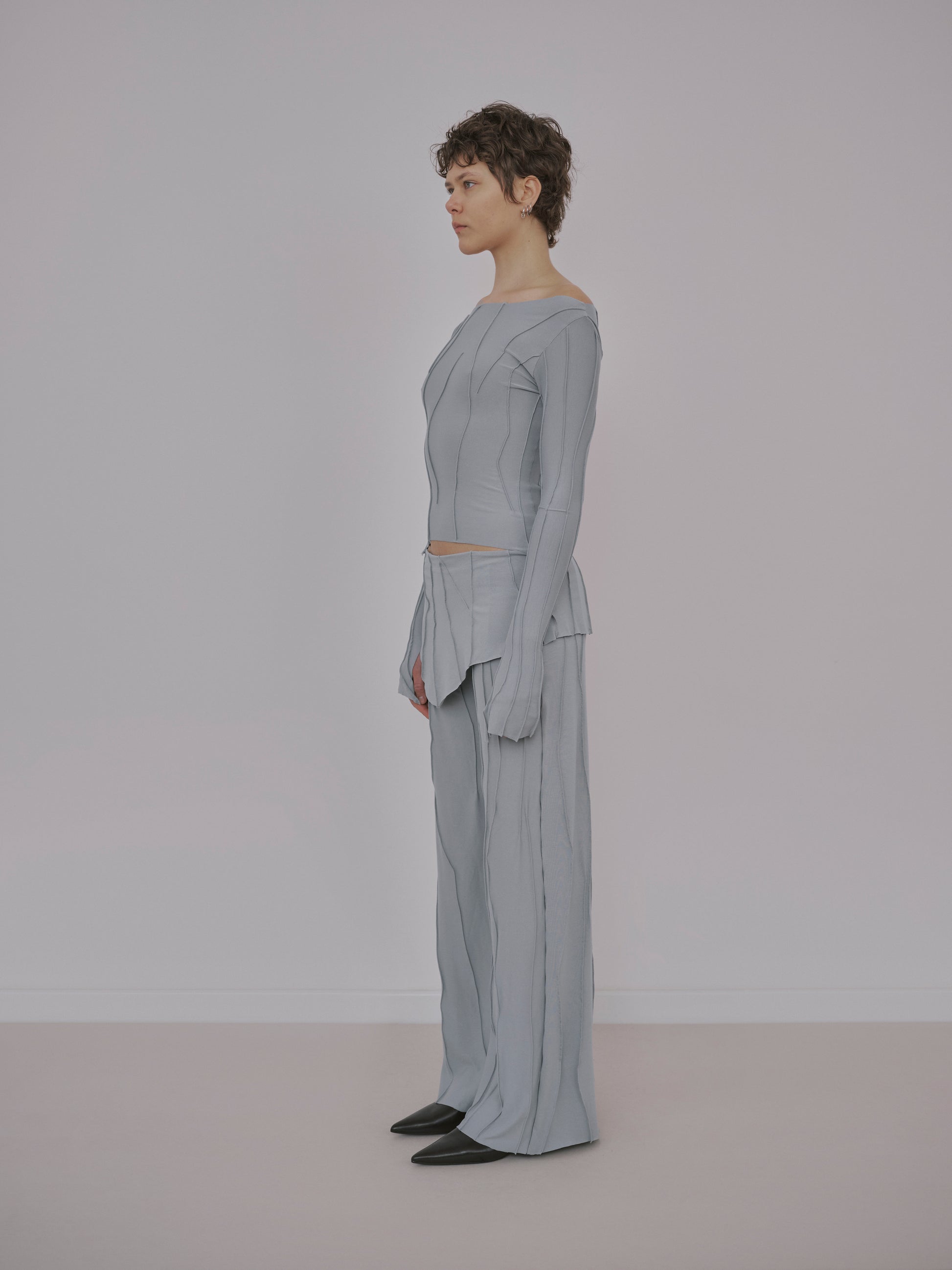 Low-waisted pants with a built-in mini skirt detail (non-removable).