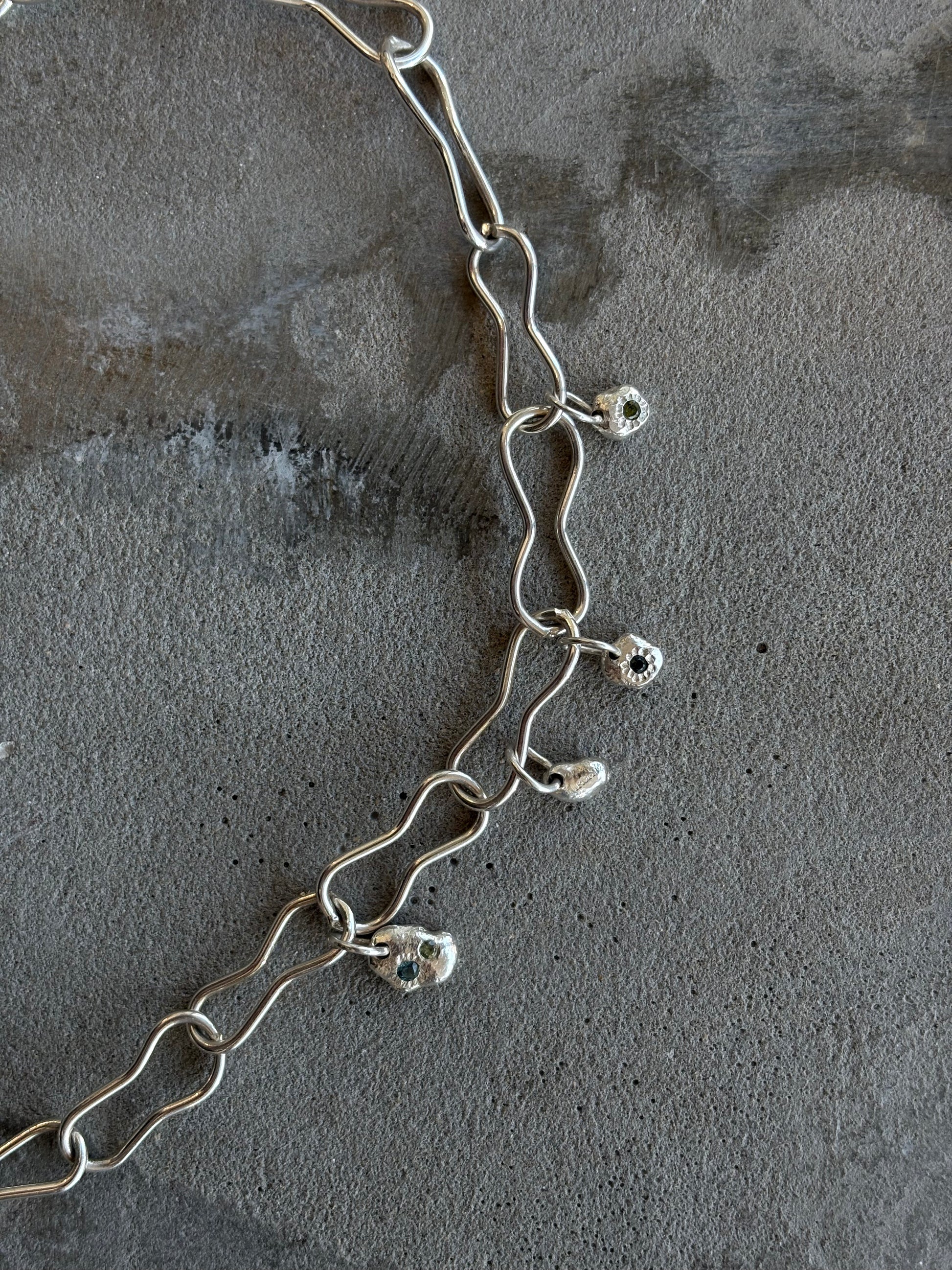 The Dogbone Shape was an accidental discovery found during the making of a custom but I loved the shape so much I decided to make it CHROMA’s signature link shape. Then came the Charmed Dogbone a combination of our MINI + CHUNKY Dogbones, bedazzled mini Sapphire charms, and a bolt clasp to create this unique statement piece.