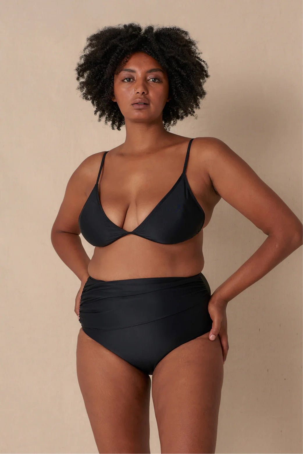 A timeless fixed triangle bikini top featuring elastic under bust, soft removable cups and adjustable straps.