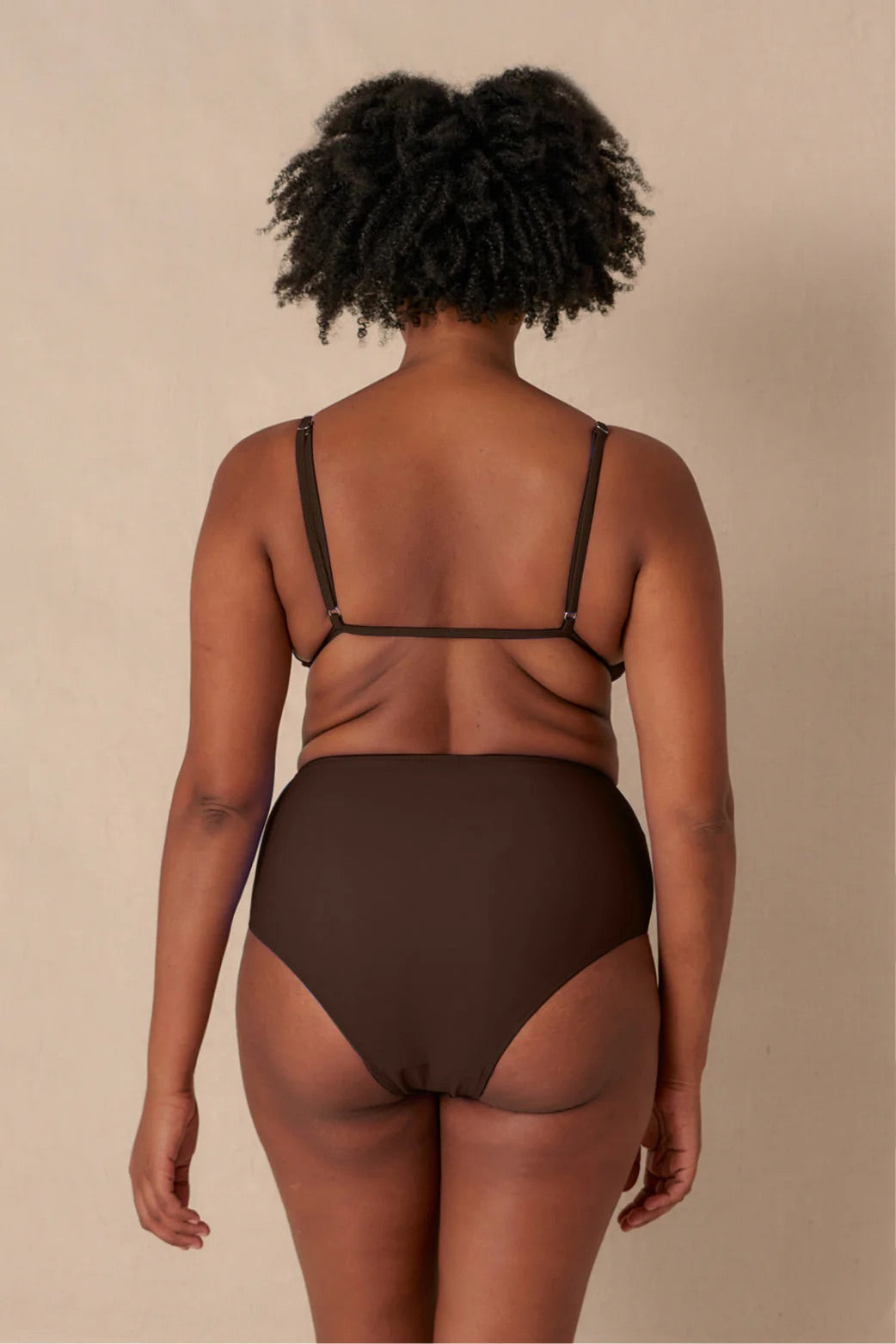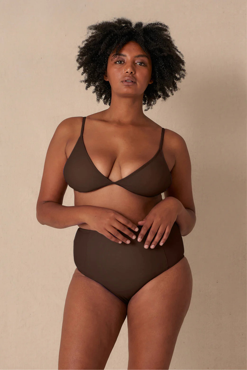 A timeless fixed triangle bikini top featuring elastic under bust, soft removable cups and adjustable straps.